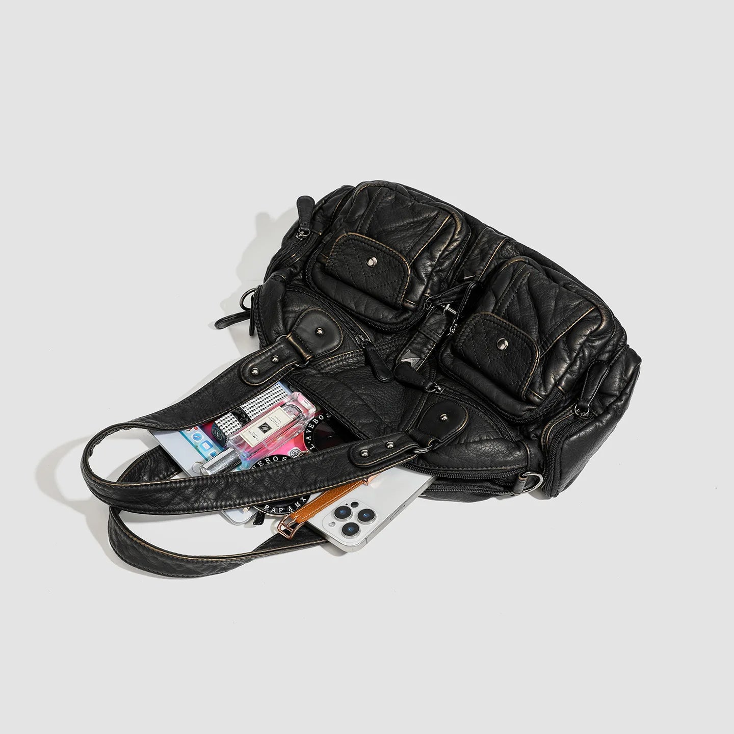 Oui. L’intérieur est organisé avec des poches zippées et des compartiments pratiques, parfaits pour garder vos essentiels bien rangés : téléphone, clés, portefeuille, stylos.